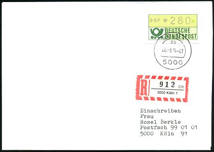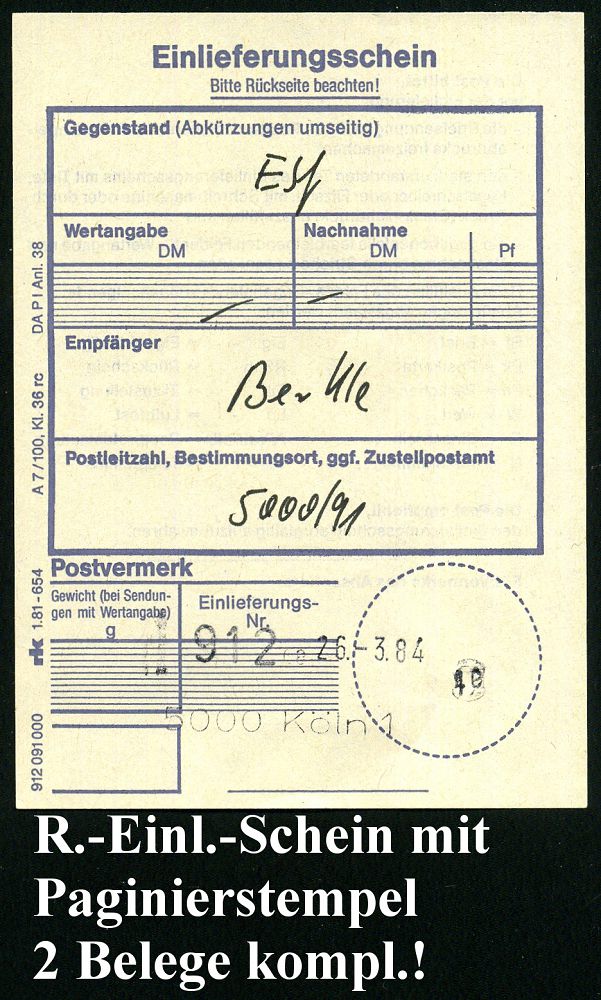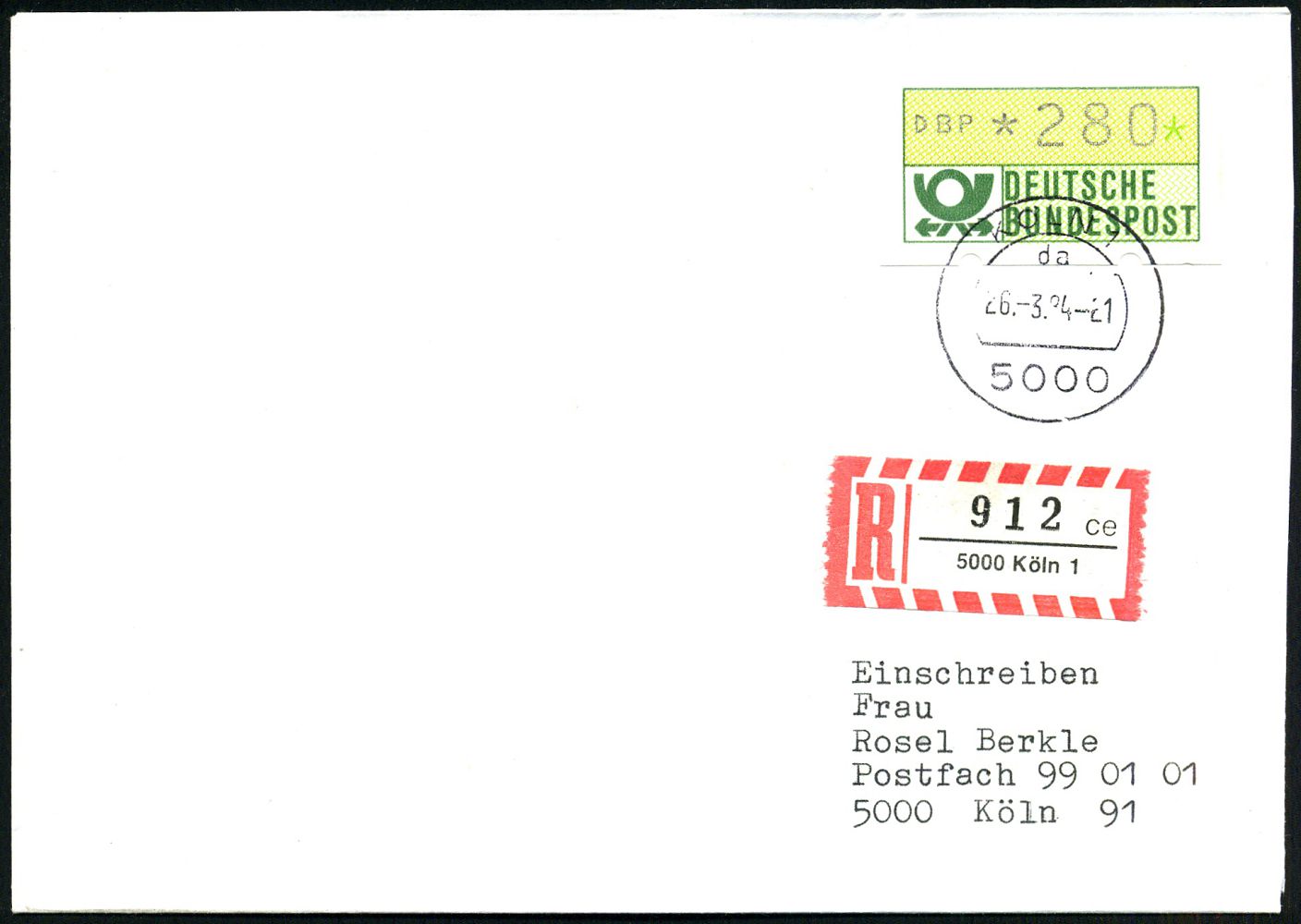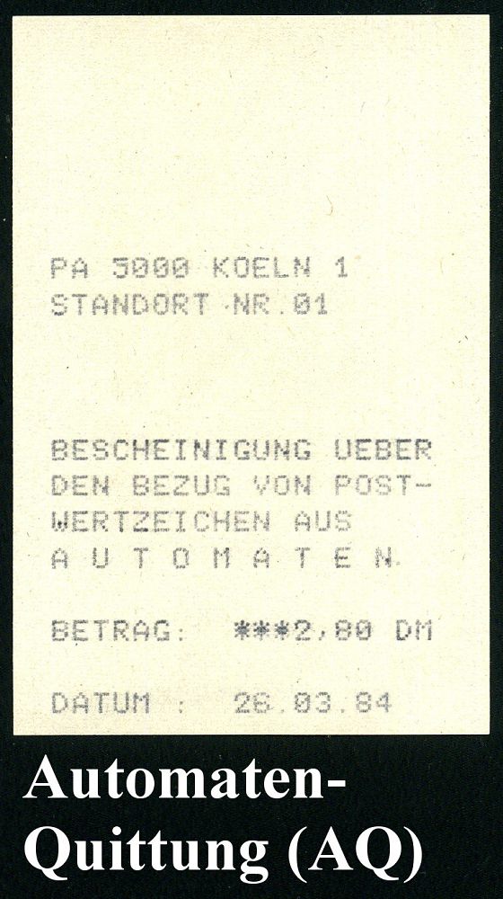 8930 | 18 € | 5000 KÖLN (Allgem. Teil, Tagesstempel, Ganzsachen etc.) : 5000 KÖLN 1/ da 1984 (26.3.) 1K-Segment auf ATM 280 Pf. EF + R-Zettel: 5000 Köln 1/ce + R-Einl.-Schein mit Paginier-Stempel + ATM-Quittung (neues Posthorn) Orts-R-FDC für Standort Hauptbahnhof, 3 Belege kompl.! (Mi.1) | ![]() ![]() ![]() | |