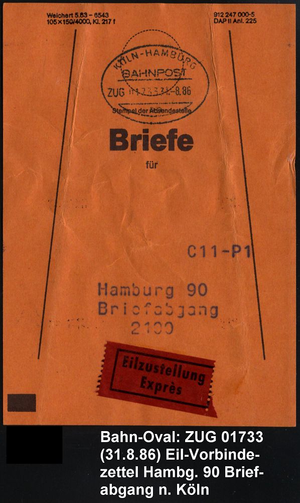 8931 | 15 € | 5000 KÖLN (Allgem. Teil, Tagesstempel, Ganzsachen etc.) : KÖLN-HAMBURG/ BAHNPOST/ ZUG 01733/ ap 1986 (31.8.) Bahn-Oval + viol. 3L: Hamburg 90/ Briefabgang/2100 klar auf Vorbinde-Zettel "Briefe" + Express-Label | ![]() | |