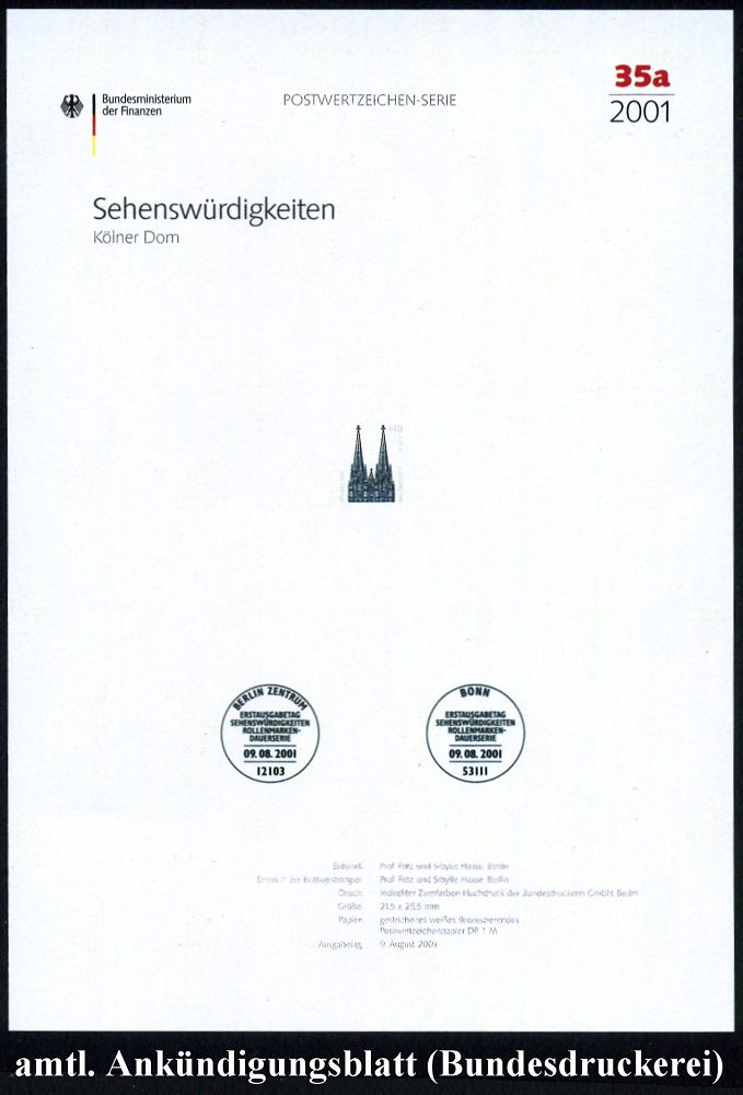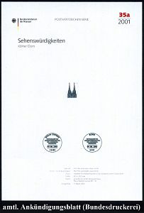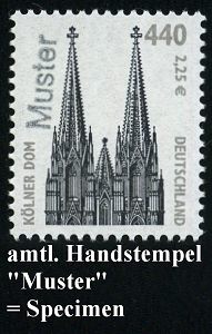 8934 | 25 € | 5000 KÖLN (Allgem. Teil, Tagesstempel, Ganzsachen etc.) : Köln 2001 (Juli) 440 Pf. Dauerserie Kölner Dom + amtl. Handstempel "M u s t e r" , postfr. + amtl. Ankündigungsblatt Finanzministerium (Format A 4) 2 Belege kompl.!, selten! (Mi.2206 "Muster" = Specimen) | ![]() ![]() | |
