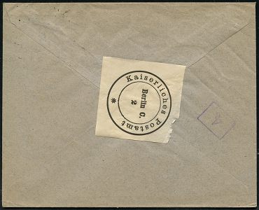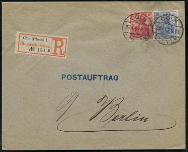 8886 | 20 € | 5000 KÖLN (Allgem. Teil, Tagesstempel, Ganzsachen etc.) : Köln 1902 (23.4.) 1K-Gitter: CÖLN/*(RHEIN) 1/w + vieseitig gez. RZ: Cöln (Rhein) 1./B ("R" rechts) Frankatur Germania 10 Pf. u. 20 Pf., rs. schw. Verschlußzettel: Kaiserl. Postamt/Berlin C./2, Fern-Postauftrags-R-Bf.! (Mi.71/2) | ![]() ![]() | |