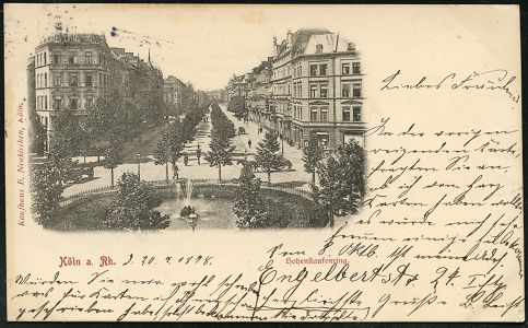 8884 | 16 € | 5000 KÖLN (Allgem. Teil, Tagesstempel, Ganzsachen etc.) : Köln 1898 (26.9.) 1K-Gitter: COELN/(RHEIN) 1/b auf s/w.-Foto-Ak.: Hohenstaufenring (mit Springbrunnen) Bedarf n. Quedlinburg (Uhv.: Kaufhaus B. Neukirchen, Köln) | ![]() ![]() | |