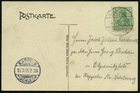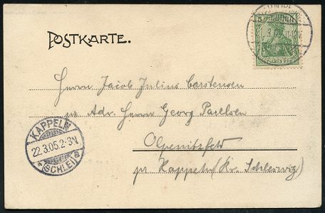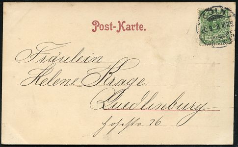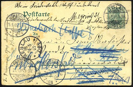 8889 | 20 € | 5000 KÖLN (Allgem. Teil, Tagesstempel, Ganzsachen etc.) : Köln-Nippes 1905 (Mai) 1K-Gitter: CÖLN-/NIPPES/c auf mehrfach nachgesandter Inl.-P. 5 Pf. Germania, div. TS., 4 verschiedene Stempeltypen! u.a.: 1K-Gitter: FRIEDEWALDE/*(WESTPR)* u. 1K: BRESLAU 16 etc., (Mi.P 64 X) | ![]() | |
