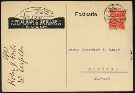 8901 | 16 € | 5000 KÖLN (Allgem. Teil, Tagesstempel, Ganzsachen etc.) : KÖLN/ *1f 1922 (9.11.) 1K-Brücke auf EF 3 Mk. Posthorn, rot auf Reklame-Kt.: WILHELM EISFELLER, GRAFISCE KUNSTANSTALTEN (Eisbär mit Polar-Sonne) Infla-Kt. n. Arolsen (Mi.225 EF) | ![]() | |