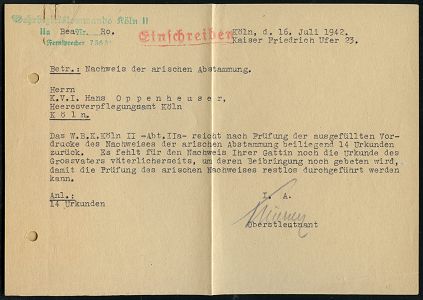 8913 | 20 € | 5000 KÖLN (Allgem. Teil, Tagesstempel, Ganzsachen etc.) : Köln 1942 (16.7.) grüner 3L: Wehrbezirkskommando Köln II... auf Dienst-Briefbogen (Format A5, links gelocht u. kl. Rostfleckchen) Inhalt über unzureichenden "Arier-Nachweis" eines Hans Oppenheuser mit Signatur eines Oberstleutnantes, seltenes Dokument! | ![]() | |