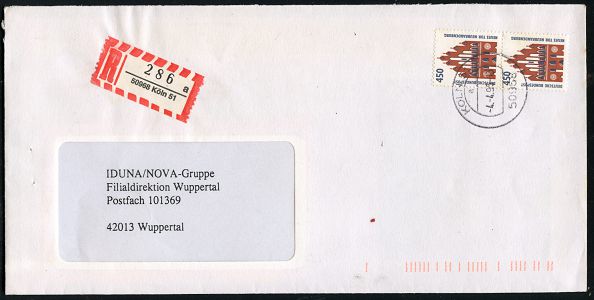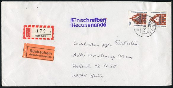 8933 | 14 € | 5000 KÖLN (Allgem. Teil, Tagesstempel, Ganzsachen etc.) : 50968 KÖLN 51/ a 1995 (4.4.) 1K-Segment auf vertikalem Paar 450 Pf. Bauwerke + R-Zettel: 50968 Köln 51/a , klar gest. Inl.-R-Bf. "Rückschein" (Mi.1623 MeF) | ![]() | |