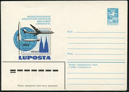 8935 | 6 € | 5000 KÖLN (Allgem. Teil, Tagesstempel, Ganzsachen etc.) : UdSSR / Köln 1983 5 Kop. U "Verkehrsmittel", blau: INTERNAT. PHILATEL. AUSSTELLUNG "LUPOSTA" 1983 (Rakete, Jet, Zeppelin u. Dom-Silhouette) ungebr. | ![]() | |