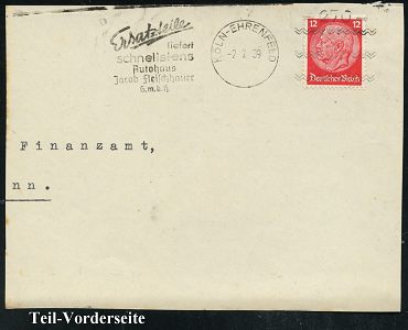 8911 | 20 € | 5000 KÖLN (Allgem. Teil, Tagesstempel, Ganzsachen etc.) : KÖLN-EHRENFELD/ =270=/ Ersatzteile/ liefert/ ..Autohaus/ Jacob Fleischhauer 1939 (2.2.) Freimarkenstempel = Frankier- u. Stempel-Apparat der "Telefonbau & Normalzeit" auf EF 12 Pf. Hindenbg., Teil-Vorderseite, seltene Vorausentwertung! (Mi.519) | ![]() ![]() ![]() | |