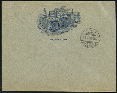 8885 | 25 € | 5000 KÖLN (Allgem. Teil, Tagesstempel, Ganzsachen etc.) : Köln 1898 (19.12.) 1K-Gitter: CÖLN/*(RHEIN)1/c, EF 10 Pf. Adler mit Firmenlochung "P. B." = J. P. B achem Verlagsbuchhandlung Verlag Köln. Volkszeitung, rs. Reklame: Firmensitz mit Pferde-Tram etc. (kl. Rißchen) Fernbf. n. Dottendorf, rs. AS: KESSENICH = frühe Firmenlochung! (Mi.47 EF Perfin) | ![]() ![]() | |