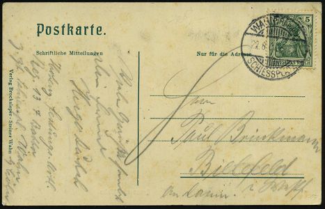 8888 | 14 € | 5000 KÖLN (Allgem. Teil, Tagesstempel, Ganzsachen etc.) : Köln-Wahn 1905 (22.3.) 1K-Gitter: WAHN (Rheinl.)-/SCHIESSPLATZ auf s/w.-Foto-Ak.: Gruss vom Schiessplatz Wahn.., 9 cm Batterie im Feuer , Bedarfs-Kt. n. Kappeln/Schlei, vs, AS. (Mi.70 EF) | ![]() ![]() | |