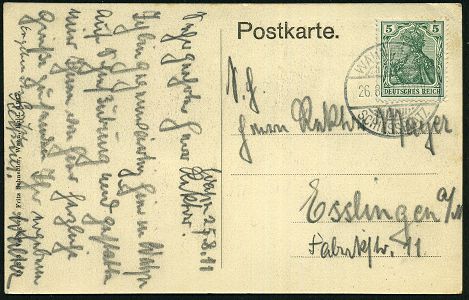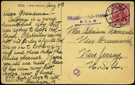 8893 | 16 € | 5000 KÖLN (Allgem. Teil, Tagesstempel, Ganzsachen etc.) : Köln 11 1913 (4.8.) 1K-Steg: CÖLN/* 11 c + viol. Abs.-2L: Continental - H o t e l / KÖLN , Bedarfs-Übersee-Foto-Ak.: Dom (Inneres) n. USA, viol. 1K: 9 (Mi.86 I) | ![]() ![]() | |