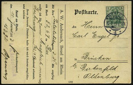 8892 | 18 € | 5000 KÖLN (Allgem. Teil, Tagesstempel, Ganzsachen etc.) : Köln-Beuel 1915 (10.8.) 1K-Gitter; BEUEL/* d * auf EF 5 Pf. Germania mit Firmen-Lochung "A" = A ndernach-Dachtechnik, klar gest. Reklame-Ak.: Entenmastanstalt Fürthenrode mit Strapazoid-Dach, selten! (Mi.85 II, EF, Perfin) | ![]() ![]() | |