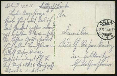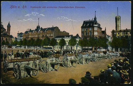 8894 | 12 € | 5000 KÖLN (Allgem. Teil, Tagesstempel, Ganzsachen etc.) : Köln 4 1915 (18.5.) 1K-Gitter: CÖLN/* 4 h auf Color-Foto-Ak.: Neumarkt mit eroberten französ. Kanonen , klar gest. Feldpost-Kt. n. Rothenstein | ![]() ![]() | |