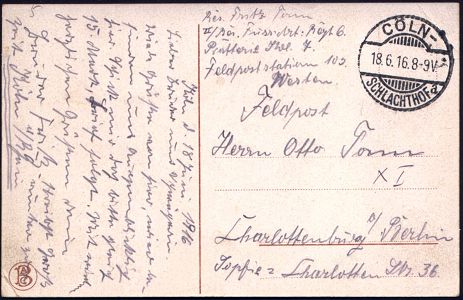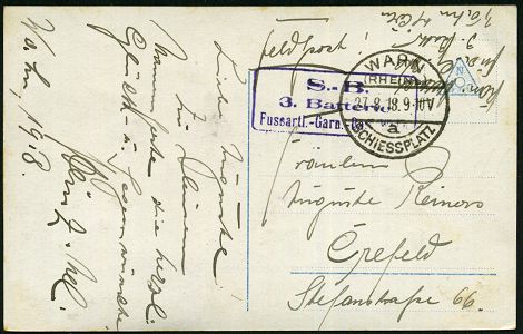 8897 | 12 € | 5000 KÖLN (Allgem. Teil, Tagesstempel, Ganzsachen etc.) : Köln-Wahn 1918 (27.8.) 1K-Brücke: WAHN/(RHEINL:)/a/SCHIESSPLATZ = Hauspostamt Truppenübungsplatz + viol. Ra.3: .. 3. Batterie/ Fussartl.-Garn.-Batl. Wahn + hs. Abs., klar gest Feldpost-Kitsch-Ak. (kl. Schürfstelle) n. Krefeld, weitere Belege "Wahn" siehe auch Sektion: PL-Raum 50.. | ![]() | |
