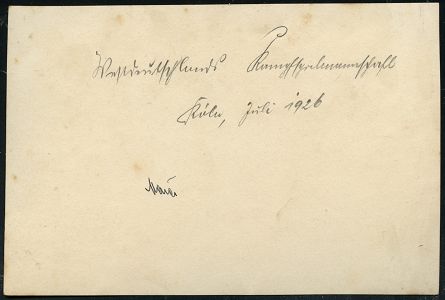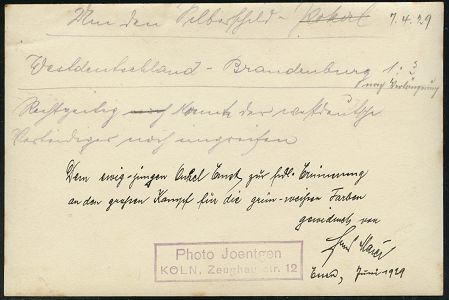8904 | 30 € | 5000 KÖLN (Allgem. Teil, Tagesstempel, Ganzsachen etc.) : Köln 1929 (7.4.) 3 s/w.-Fotos: Feldhockey-Spiel "Westdeutschland - Brandenburg" (1:3) rs. entspr. Text + viol. Uhv.-Ra.: Photo Joentgen KÖLN.., 3 Belege, vergl. Kat.-Nr. 8902 (alle Format: 16,8 x 11,5 cm) | ![]() ![]() ![]() ![]() | |