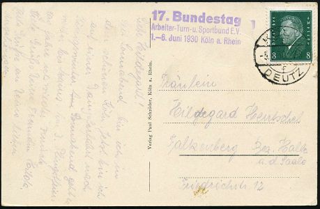 8905 | 25 € | 5000 KÖLN (Allgem. Teil, Tagesstempel, Ganzsachen etc.) : KÖLN/ f/ -DEUTZ 1930 (5.6.) 1K-Brücke + viol. 3L-HdN.: 17. Bundestag/Arbeiter-Turn-u. Sportbund E.V... , seltene Bedarfs-s/w.-Foto-Ak.: Köln von der Rheinseite | ![]() ![]() | |