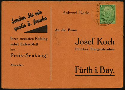 8906 | 16 € | 5000 KÖLN (Allgem. Teil, Tagesstempel, Ganzsachen etc.) : KÖLN-/ a/ HÖHENBERG 1939 (6.3.) 1K-Brücke auf Ganzsachen-Ausschnitt 5 Pf. Hindenbg.!, EF auf (halber) Firmen-Antwort-Kt. n. Fürth, ungewöhnliche Frankatur! (Mi.P 225) | ![]() ![]() | |