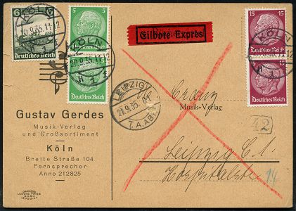 8907 | 18 € | 5000 KÖLN (Allgem. Teil, Tagesstempel, Ganzsachen etc.) : KÖLN/ H 1 f 1935 (20.9.) 1K-Brücke auf 46 Pf.-Frankatur, Firmen-Kt.: Gustav Gerdes, Musik-Verlag u. Großsortiment mit Notenschlüssel (2 kl. Randrißchen, 1x Reg.-Loch geschl.) klar gest. Inl.-Eil-Karte n. Leipzig, vs. AS. Telegrafenamt | ![]() | |