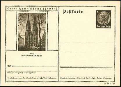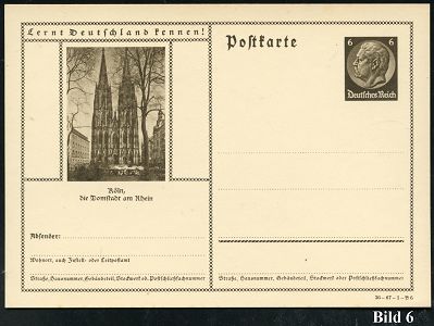 8908 | 10 € | 5000 KÖLN (Allgem. Teil, Tagesstempel, Ganzsachen etc.) : Köln 1936 6 Pf. BiP Hindenburg, braun: Köln, die Domstadt am Rhein = Kölner Dom, ungebr. (Mi.P 236-36-67-1-B 5) | ![]() | |