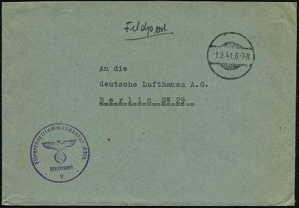8912 | 20 € | 5000 KÖLN (Allgem. Teil, Tagesstempel, Ganzsachen etc.) : Köln 1941 (1.9.) stumme 1K-Gitterbrücke = Tarnstempel Köln + viol. 1K-HdN: Fliegerhorstkommandantur Köln/V , klar gest. Feldpost-Bf. an Lufthansa, Berlin | ![]() | |