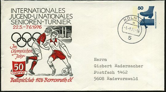 8918 | 10 € | 5000 KÖLN (Allgem. Teil, Tagesstempel, Ganzsachen etc.) : 5 KÖLN 80/ m 1976 (1.9.) 1K-Segment auf PU 50 Pf. Unfall: INT. JUGEND- U. NATIONALES SENIOREN-TURNIER..Ballspielclub 1926 Berrenrath eV. (= 2 Spieler, Olymp. Ringe etc.) geringe Randspuren., Bedarfs-Inl.-Bf. (Mi.PU 65/33) | ![]() | |