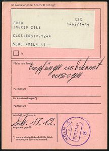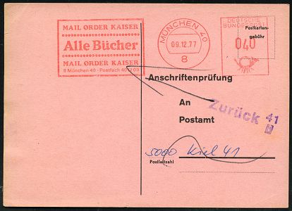 8919 | 18 € | 5000 KÖLN (Allgem. Teil, Tagesstempel, Ganzsachen etc.) : 5 KÖLN 41/ c 1977 (15.12.) violetter 1K-Segment rs. auf Anschriftenprüfung (rot) vs. AFS: 8 MÜNCHEN 40/MAIL ORDER KAISER/Alle Bücher.., seltene Retour-Kt. (n. Köln 41) | ![]() ![]() | |