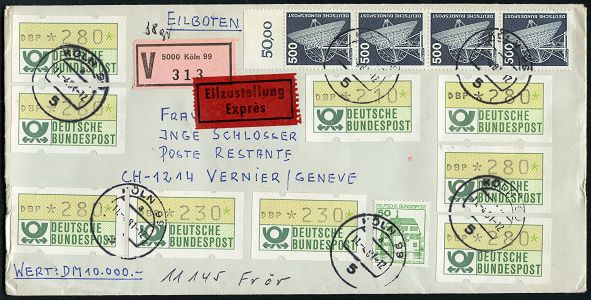 8920 | 40 € | 5000 KÖLN (Allgem. Teil, Tagesstempel, Ganzsachen etc.) : 5 KÖLN 99/ a 1981 (11.4.) 1K-Segment mehrfach auf 4er-Streifen Technik 5.- Mk + ATM 1x 210 Pf., 2x 230 Pf. u. 6x 280 Pf. + 50 Pf. Burgen = 44.- DM ! + rosa V-Zettel: 5000 Köln 99, seltener, gesiegelter Ausl.-Eil-Wert-Bf. 10.000.- DM in die Schweiz, rs.AS. (Mi.859 (4), ATM 1 etc.) | ![]() ![]() | |