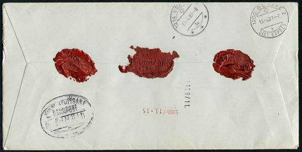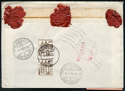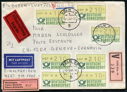 8921 | 20 € | 5000 KÖLN (Allgem. Teil, Tagesstempel, Ganzsachen etc.) : 5 KÖLN 99/ a 1981 (9.5.) 1K-Segment auf ATM 3x 10 Pf., 4x 210 Pf. = 870 Pf. + rs. nachgeklebt 2x 40 Pf. Burgen (Mi.1037) + rosa Klebezettel: Wertangabe Goldfr. 1115 + rosa V-Zettel: 5000 Köln 99, rs. gesiegelter Ausl.-Flp.-Eil-Wertbf. 1000.- DM n. Genf, rs. AS. (ATM 1 I) | ![]() ![]() | |