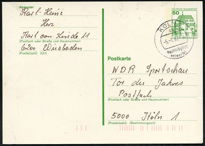 8922 | 8 € | 5000 KÖLN (Allgem. Teil, Tagesstempel, Ganzsachen etc.) : KÖLN 1/ ck/ Nachträglich/ entwertet 1982 (5.1.) 1K-Segment ohne PLZ klar auf Bedarfs-P 50 Pf. Burgen an den WDR, Köln | ![]() | |