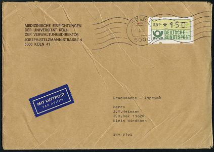 8924 | 18 € | 5000 KÖLN (Allgem. Teil, Tagesstempel, Ganzsachen etc.) : 5000 KÖLN 1/ cq 1982 RoWellenSt auf EF 150 Pf. ATM (Bf. unten Knitter) portorichtige Übersee-Flp.-Drs. 40-50 g. nach SWA, seltene Portostufe! (Mi.1) | ![]() | |