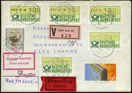 8925 | 20 € | 5000 KÖLN (Allgem. Teil, Tagesstempel, Ganzsachen etc.) : 5 KÖLN 99/ a 1982 (2.2.) 1K-Segment auf ATM-Frankatur + roter Ra2.: Gebühr bezahlt/Taxe percue (hs. "7 DM 50 Pf.") + rosa V-Zettel: 5000 Köln 99 , gesiegelter Inl.-Eil-Wert-Bf. 5000.- DM n. Lohmar (Mi.1 ua.) | ![]() | |