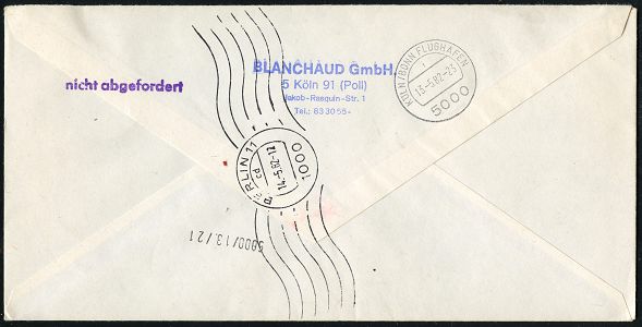 8928 | 20 € | 5000 KÖLN (Allgem. Teil, Tagesstempel, Ganzsachen etc.) : 5 KÖLN 99/ d 1982 (13.5.) 1K-Segment auf ATM-Frankatur + roter Doppel-Ra.2: Gebühr bezahlt/Taxe percue + roas VZ: 5000 Köln 99 , dekorativer Sonderumschlag: XII. Deutscher Schlaraffentag / 100 Jahre Schlaraffia Hammonia.. , rs. div. TS, Ausl.-Retour-Eil-Wert-Bf. 500.- DM (n. West-Berlin) | ![]() | |
