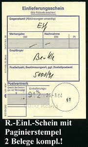 8932 | 14 € | 5000 KÖLN (Allgem. Teil, Tagesstempel, Ganzsachen etc.) : 50668 KÖLN 1/ ae 1995 (16.1.) 1K-Segment auf vertikalem Paar 450 Pf. Bauwerke + R-Zettel: 50668 Köln 1 , klar gest. Inl.-R-Bf. "Rückschein" = seltene Portostufe n. Berlin (Mi.1623 MeF) | ![]() | |