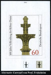 8923 | 150 € | 5000 KÖLN (Allgem. Teil, Tagesstempel, Ganzsachen etc.) : Köln 1980 60 Pf. "100 Jahre Vollendung Kölner Dom" = Schlußstein, orig. Alternativ-Entwurf v. Prof. Paul Froitzheim im Format 16 x 19 c im Passapartout mit amtl. Registrier-Nr., rs. Signatur "Froitzheim" + Foto-Essay in Orig.-Größe + Zertifikat + eigenhänd. Signatur "Paul Froitzheim", 3 Belege kompl.!, seltenes Unikat! (zu Mi.1064) | ![]() ![]() | |