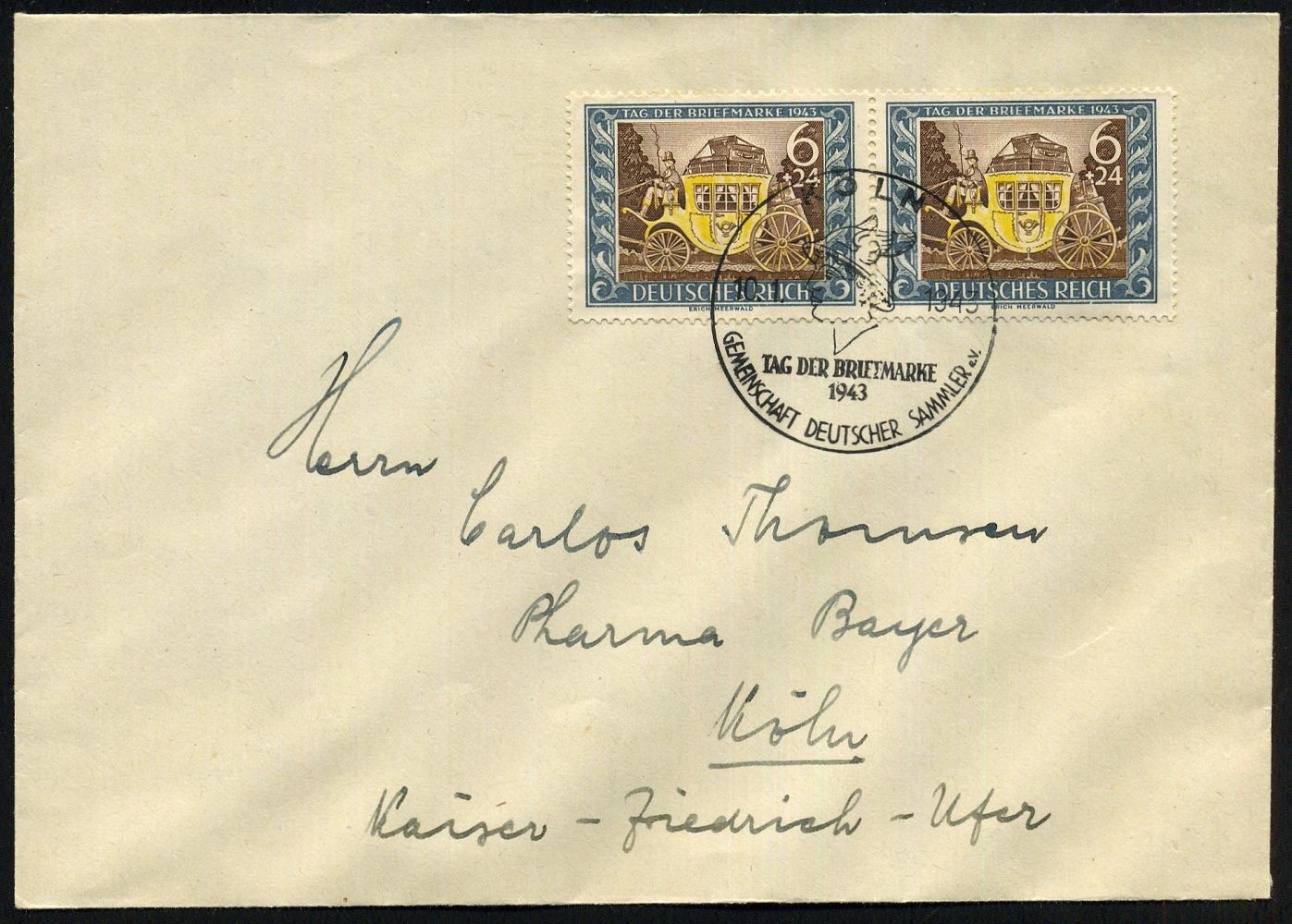 8946 | 16 € | 5000 KÖLN (Sonder- und Handwerbe-Stempel) : KÖLN/ TAG DER BRIEFMARKE/ GDS 1943 (10.1.) SSt = Merkurkopf auf Paar 6 + 24 Pf. Tag der Briefmarke (Mi. 828 MeF) klar gest., Inl.-Bf. (Bo.54) | ![]() | |
