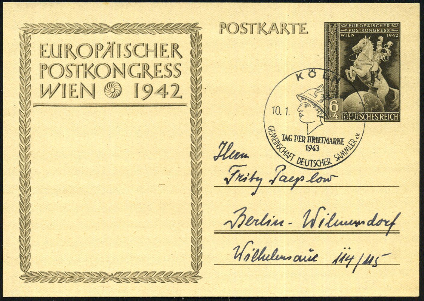 8947 | 16 € | 5000 KÖLN (Sonder- und Handwerbe-Stempel) : KÖLN/ TAG DER BRIEFMARKE/ GDS 1943 (10.1.) SSt = Merkur mit Flügelhut auf Sonder-P. 6 + 4 Pf. "Europ. Postkongress Wien" (Mi.P 294 b) Inl.-Karte (Bo.54) | ![]() | |