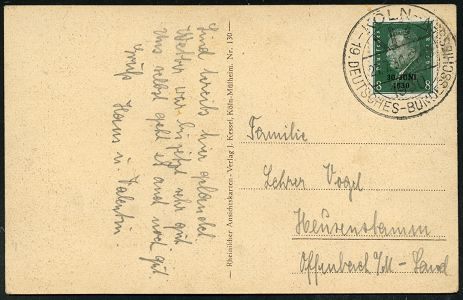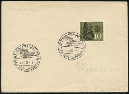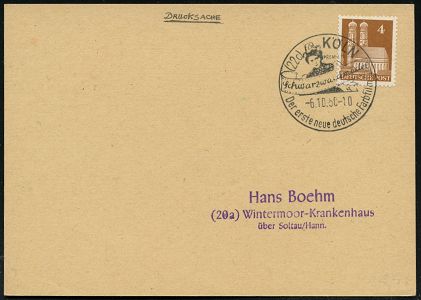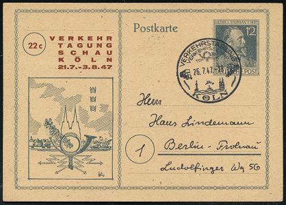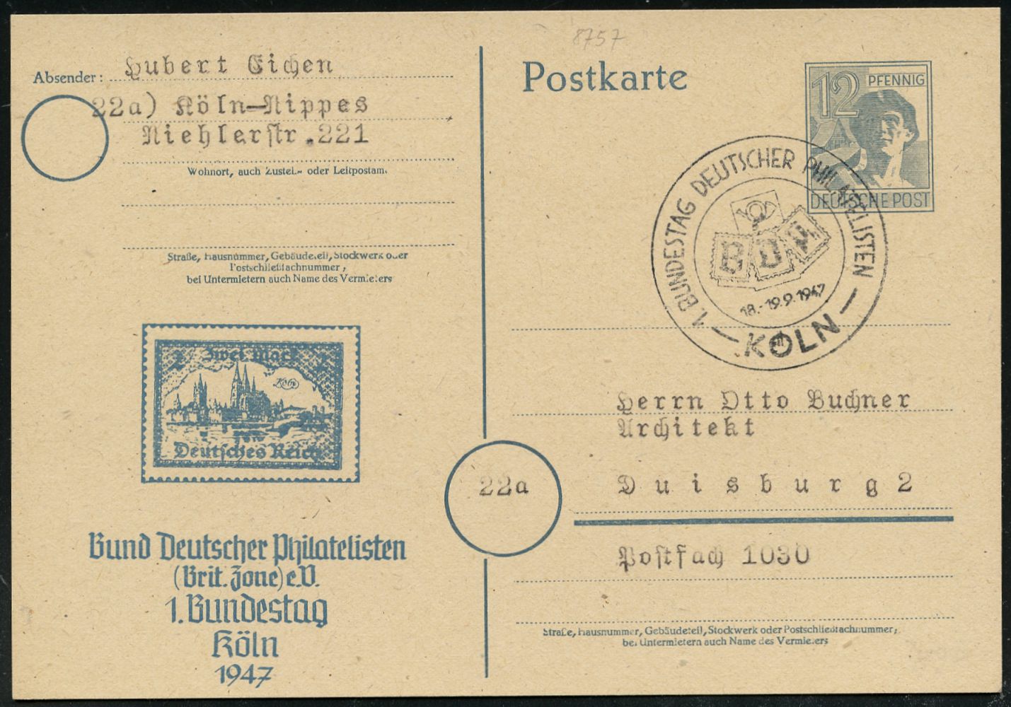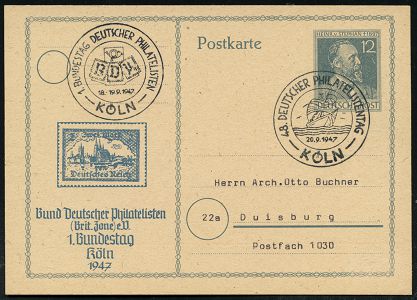 8949 | 20 € | 5000 KÖLN (Sonder- und Handwerbe-Stempel) : KÖLN/ 1.BUNDESTAG DEUTSCHER PHILATELISTEN/ BDPh 1947 (Sept.) SSt auf amtl. P 12 Pf. H. v. Stephan mit Zudruck: BDPh, (Brit.Zone) e.V., 1.Bundestag.. (Abb. 2 RM (DR Mi.365) mit Kölner Dom (ME.P 961-Z 14.), Inl.-Karte (Bo.60) | ![]() | |