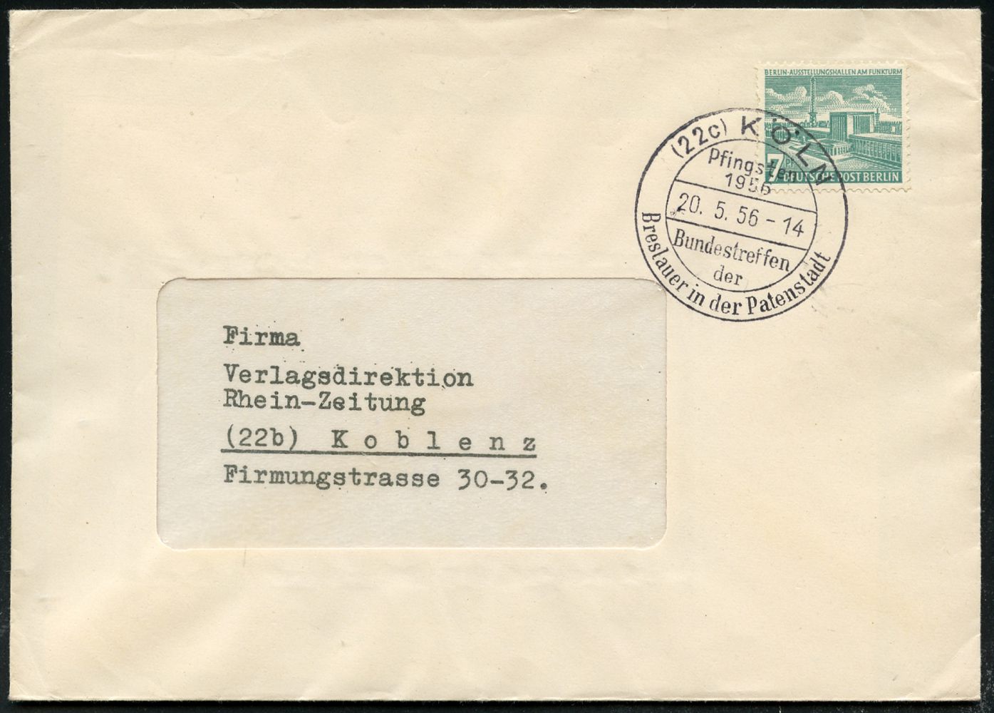 8953 | 15 € | 5000 KÖLN (Sonder- und Handwerbe-Stempel) : (22c) KÖLN/ Bundestreffen/ der/ Breslauer in der Patenstadt 1956 (20.5.) seltener SSt klar auf Inl.-Drs.-Bf. (Bo.128) | ![]() | |