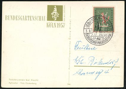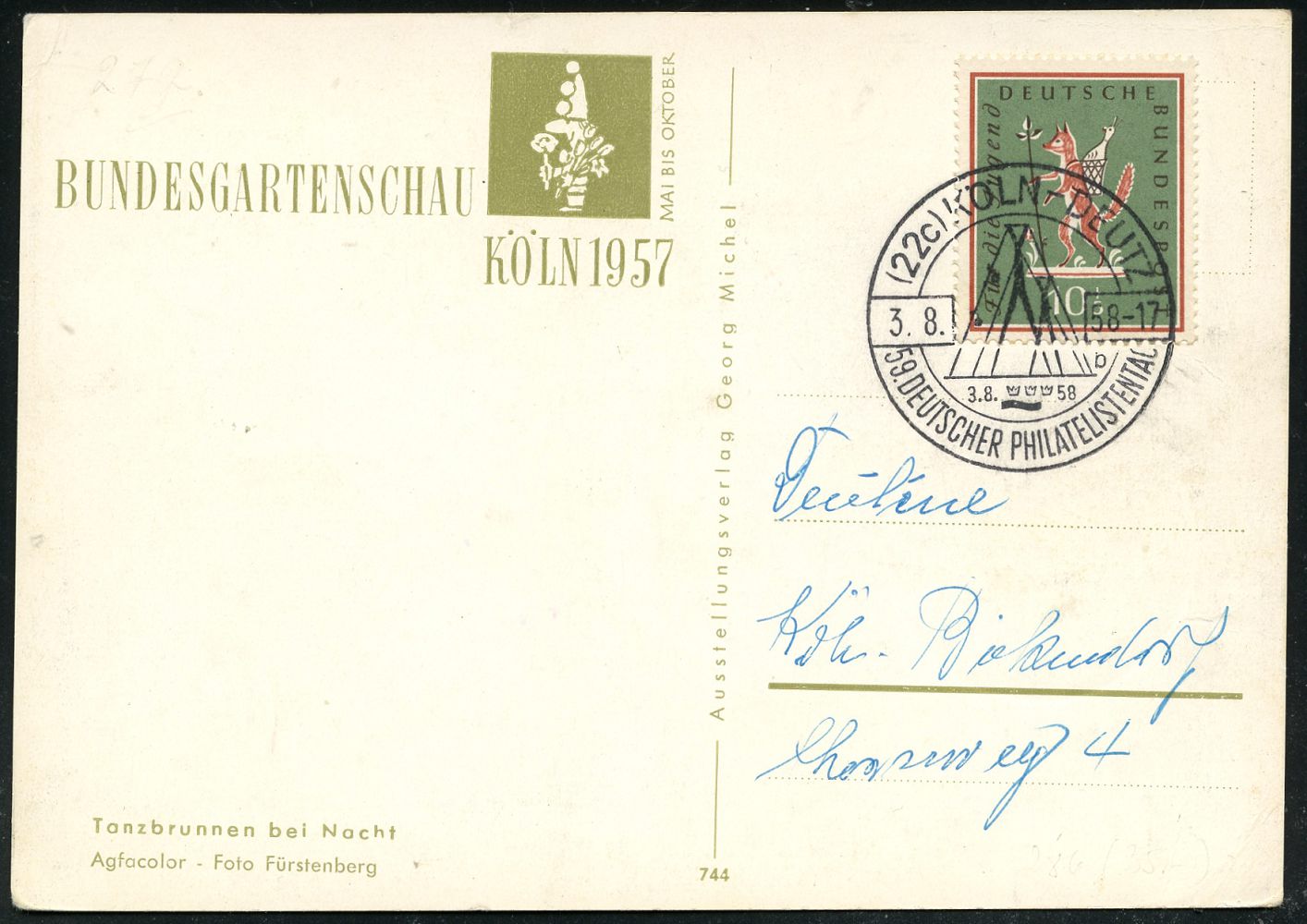 8955 | 18 € | 5000 KÖLN (Sonder- und Handwerbe-Stempel) : (22c) KÖLN-DEUTZ/ b/ 59.DEUTSCHER PHILATELISTENTAG 1958 (3.8.) SSt mit UB "b" = Pylone der Rhein-Seilbahn (der BUGA) klar auf EF 10 + 5 Pf. Wofa (Fuchs, Mi.286 EF, + 17.- EUR) Color-Sonder-Ak.: Bundesgartenschau Pavillon mit Tanzbrunnen (Michalis Nr.48), klar gest. Orts-Kt. (Bo.147 b) | ![]() ![]() | |