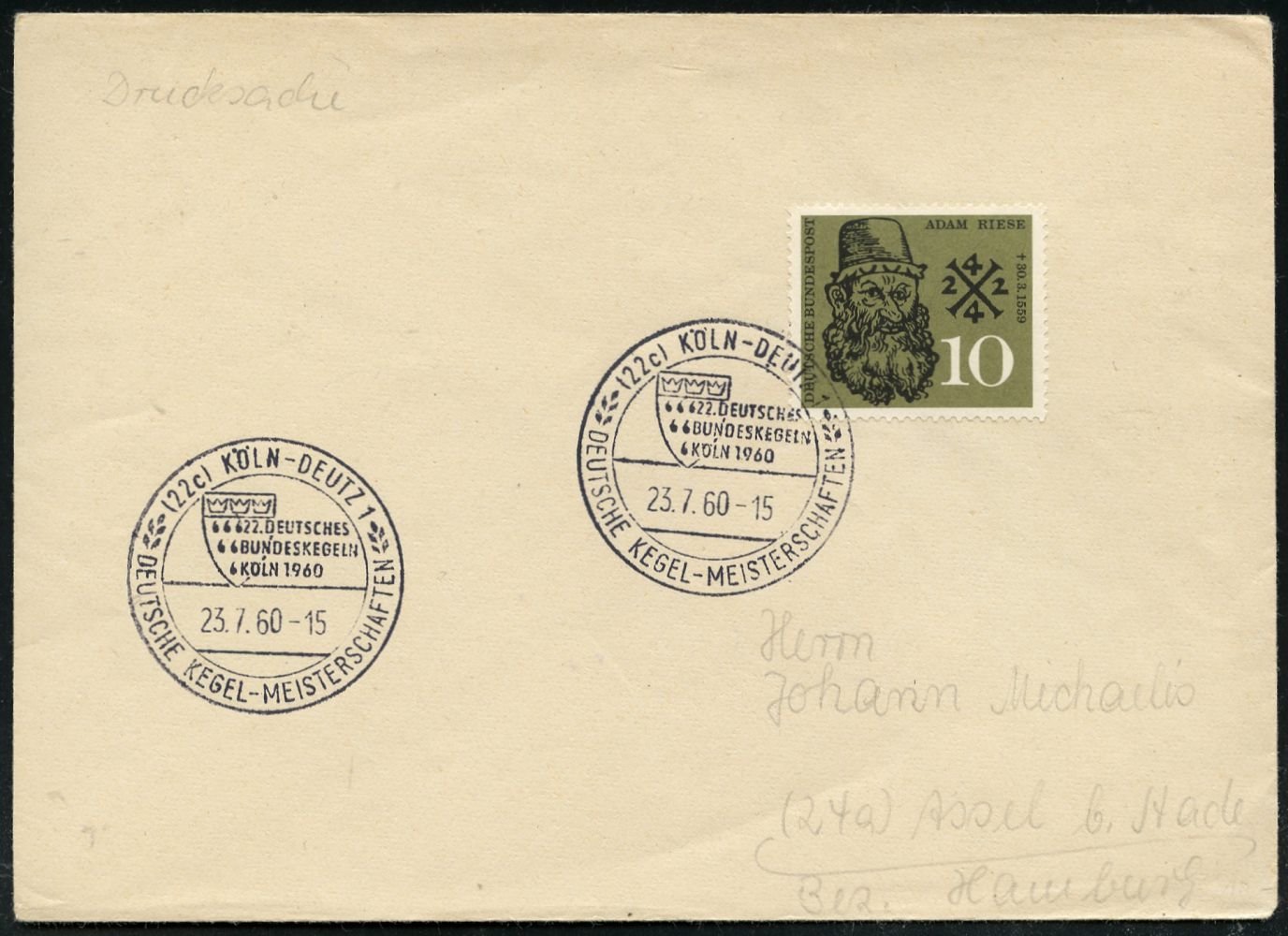 8958 | 15 € | 5000 KÖLN (Sonder- und Handwerbe-Stempel) : (22c) KÖLN-DEUTZ 1/ 22.DEUTSCHE / BUNDESKEGELN/ DEUTSCHE KEGEL-MEISTERSCHAFTEN 1960 (23.7.) SSt (Stadtwappen) klar gest. Inl.-Bf. (Bo.179) | ![]() | |