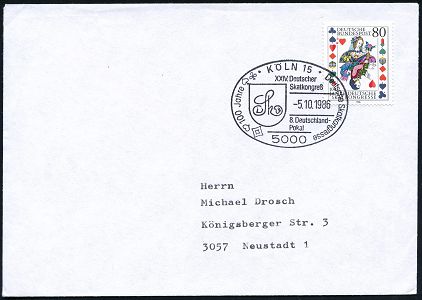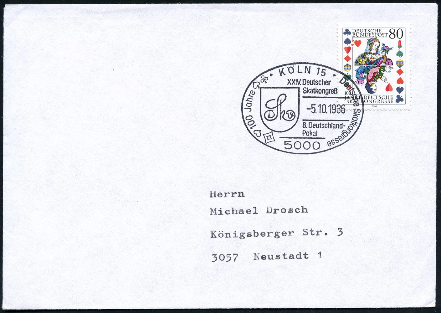 8967 | 12 € | 5000 KÖLN (Sonder- und Handwerbe-Stempel) : 5000 KÖLN 15/ XXIV. Dt./ Skatkongreß.. 1986 (5.10.) SSt (Wappen) auf passender EF 80 Pf. "100 Jahre Skatkongresse" (Mi.1293 EF) Inl.-Bf. | ![]() | |