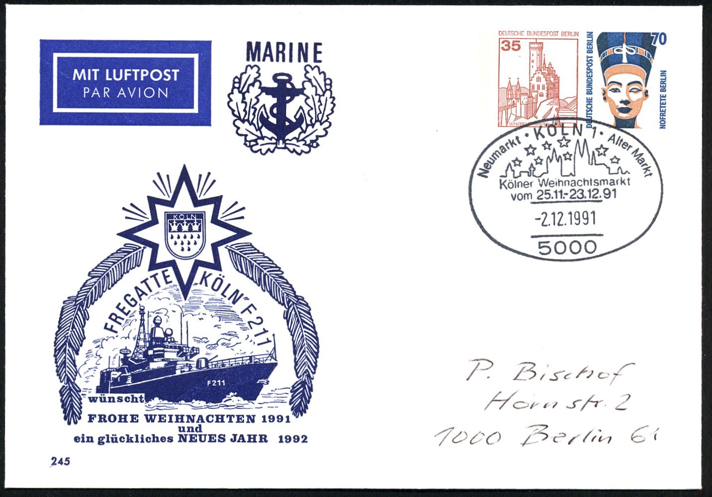 8969 | 12 € | 5000 KÖLN (Sonder- und Handwerbe-Stempel) : 5000 KÖLN 1/ Kölner Weihnachtsmarkt.. 1991 (2.12.) SSt auf PU Berlin 35 Pf. Burgen + 20 Pf. Nofretete: FROHE WEIHNACHTEN 1991, FREGATTE "KÖLN" F 211 (Mi.PU 303) Inl.-Flp.-Bf. n. Berlin | ![]() | |