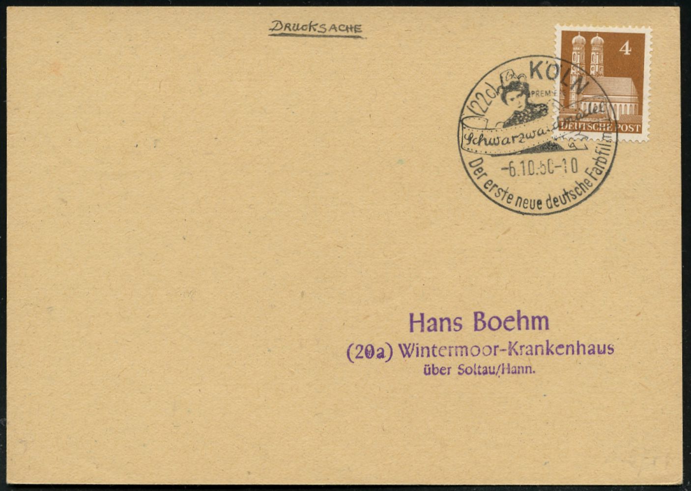 8951 | 18 € | 5000 KÖLN (Sonder- und Handwerbe-Stempel) : (22c) KÖLN/ Schwarzwaldmädel/ Der erste neue deutsche Farbfilm 1950 (6.10.) seltener SSt (Trachtenfrau) klar gest. Inl.-Drs.-Karte (Bo.115) | ![]() | |