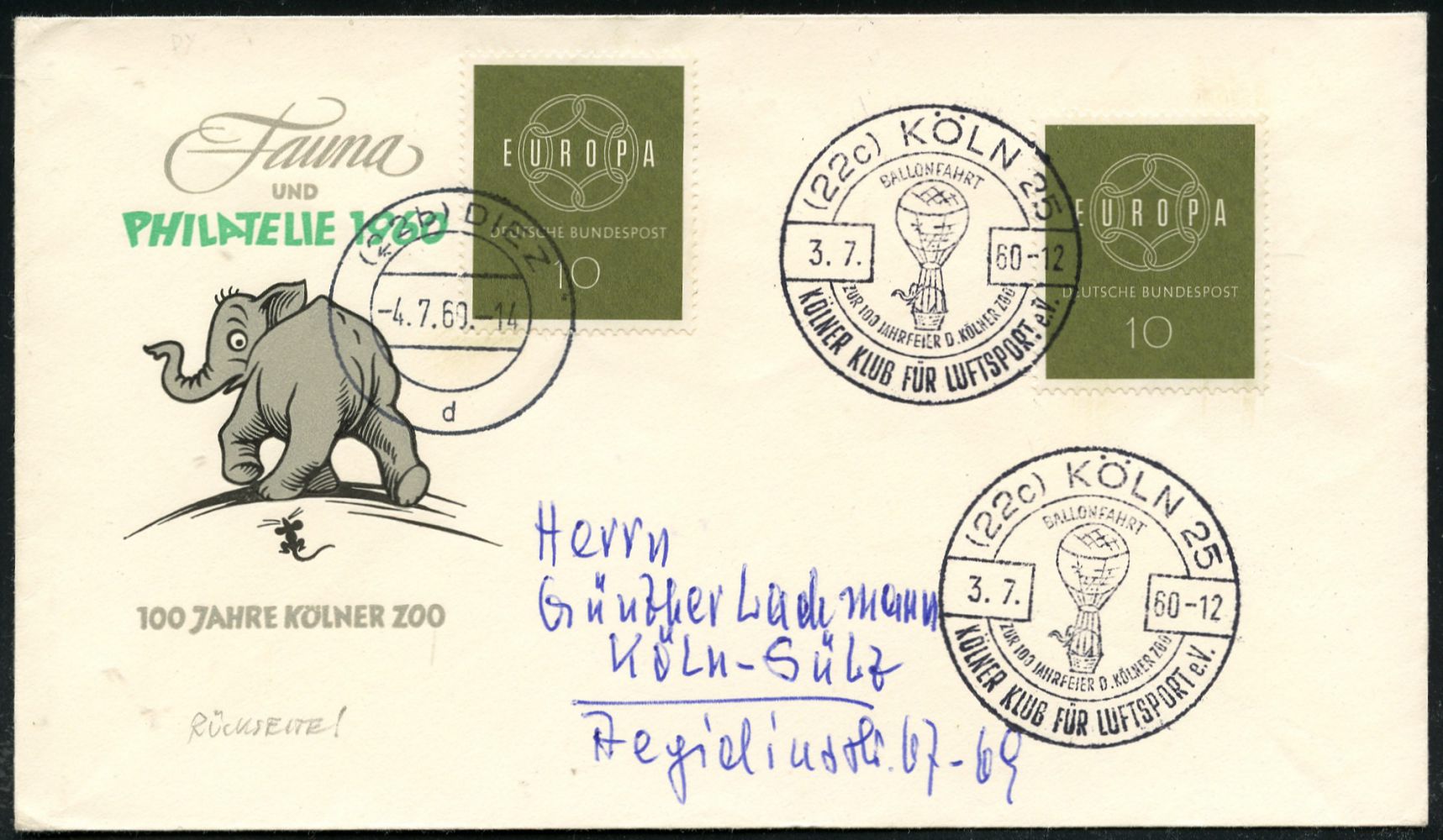 8957 | 18 € | 5000 KÖLN (Sonder- und Handwerbe-Stempel) : (22c) KÖLN 25/ BALLONSTART/ ZUR 100 JAHRFEIER D.KÖLNER ZOO/ KÖLNER KLUB FÜR LUFTSPORT e.V. 1960 (3.7.) SSt = Ballon mit Elefant 2x auf passendem Sonderumschlag "100 Jahre Kölner Zoo" (Elefant u. Maus) rs. motivgl. Ballon-HdN., Orts-Bf. (Bo.176) | ![]() ![]() | |