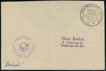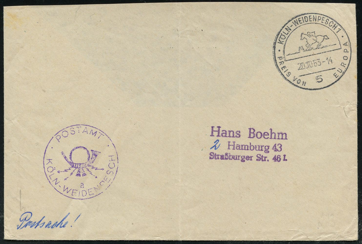 8960 | 10 € | 5000 KÖLN (Sonder- und Handwerbe-Stempel) : 5 KÖLN-WEIDENPESCH 1/ PREIS VON EUROPA 1963 (20.10.) SSt = Galopper + viol. 1K-HdN: POSTAMT/a/KÖLN-WEIDENPESCH (Posthorn) Postdienst-Bf. (rs. fehlt Klappe) klar gest.! (Bo.213) | ![]() | |
