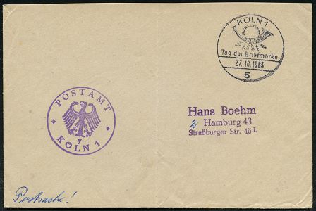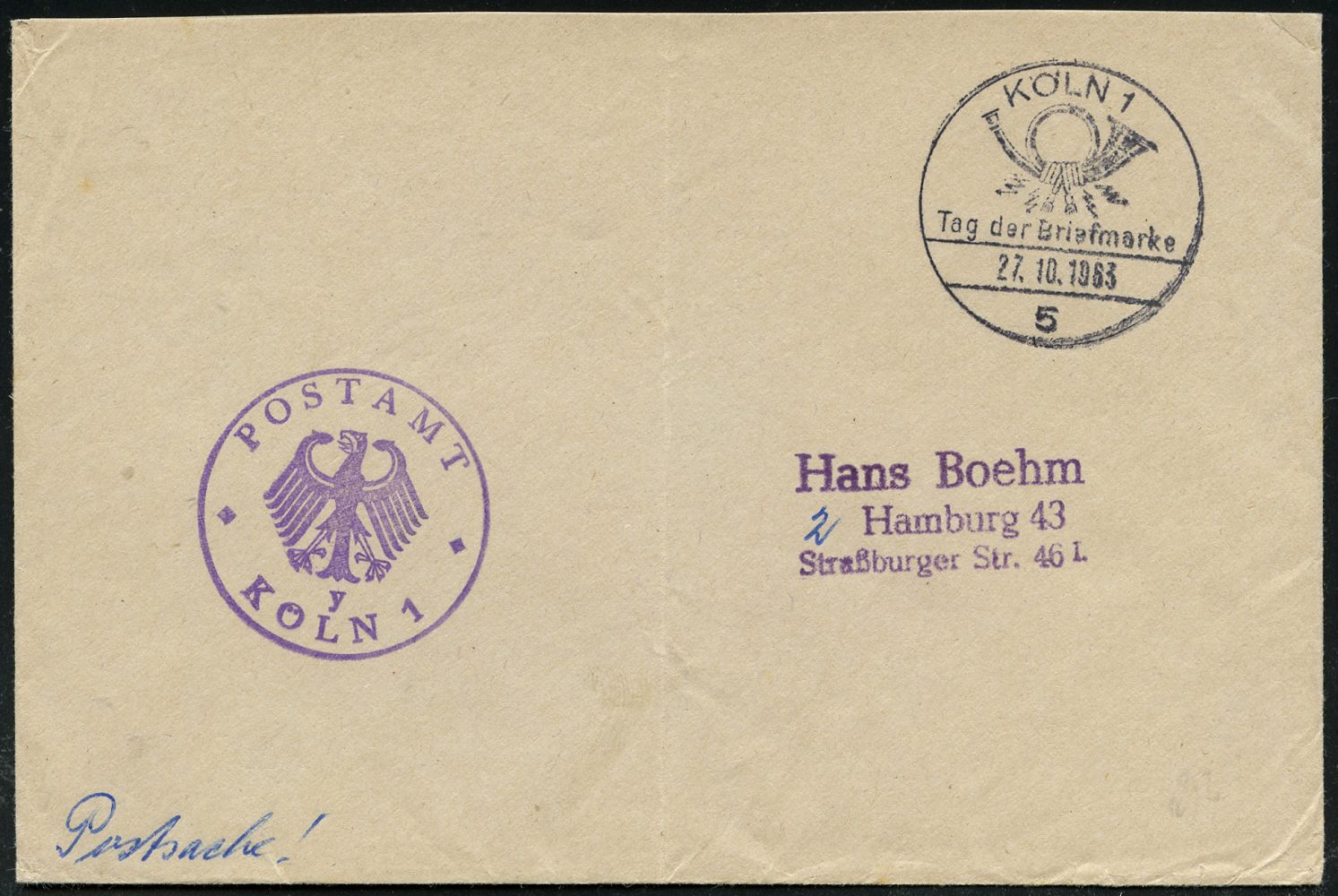 8961 | 11 € | 5000 KÖLN (Sonder- und Handwerbe-Stempel) : 5 KÖLN 1/ Tag der Briefmarke 1963 (27.10.) SSt = Posthorn) + viol., amtl. 1K-HdN: POSTAMT/y/KÖLN 1 (Bundesadler) Postdienst-Bf. (gefaltet, da Antwort-Bf.) klar gest. (Bo.214) | ![]() | |
