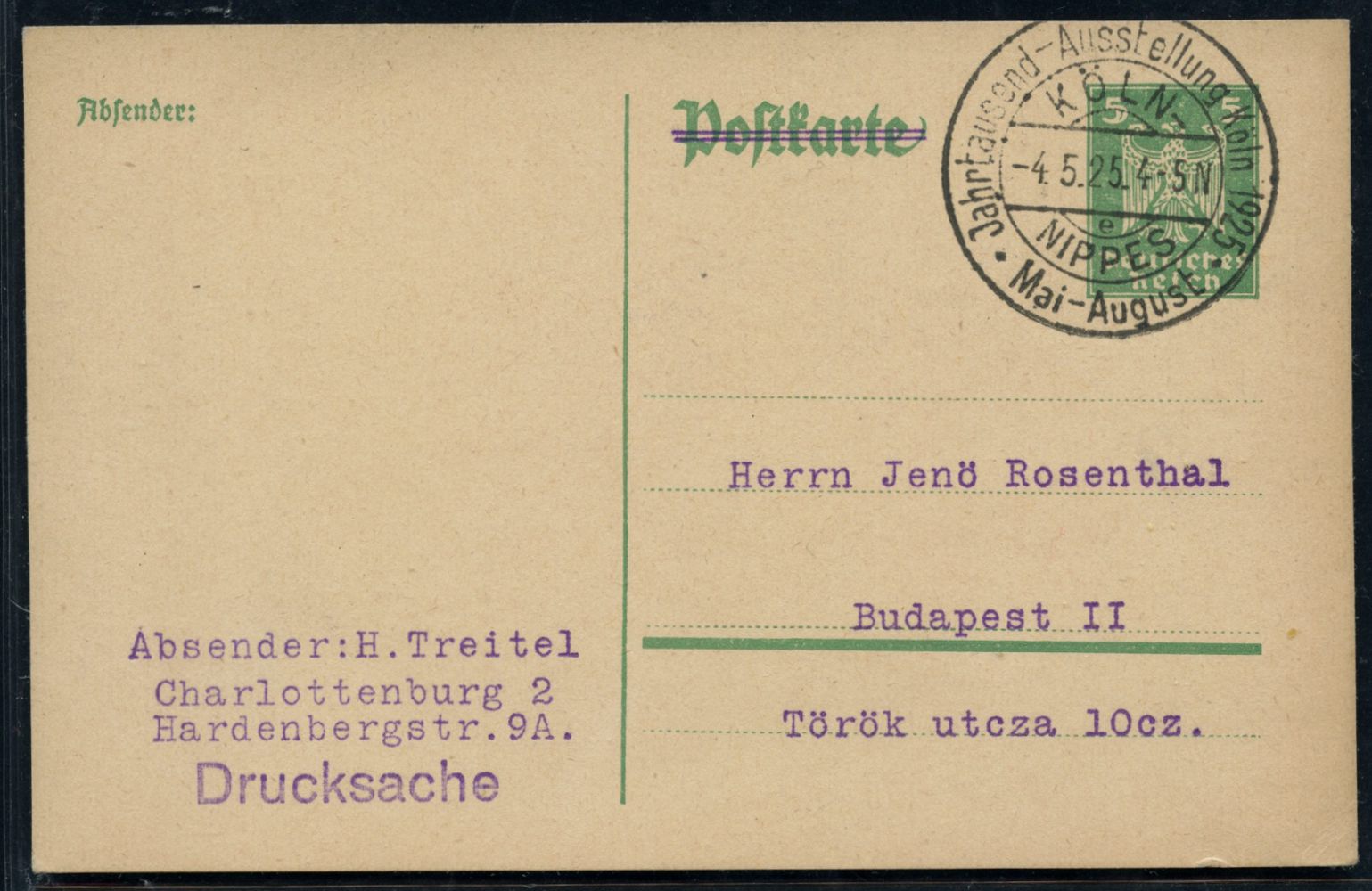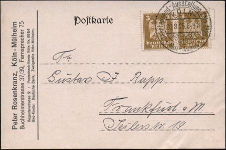 8936 | 20 € | 5000 KÖLN (Sonder- und Handwerbe-Stempel) : KÖLN-/ h/ MÜLHEIM 1/ Jahrtausend-Ausstellung Köln.. 1925 (20.8.) HWSt klar auf Firmenkt.: Peter Rosenkranz, Köln-Mülheim (Bo.7 VIII , nur 1925 verwendet) | ![]() | |