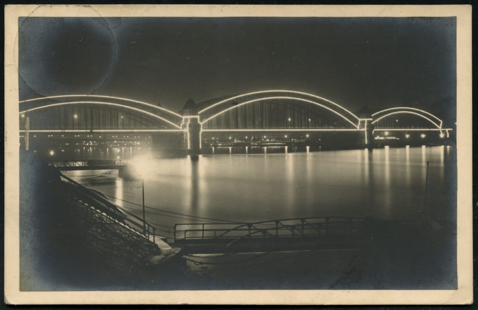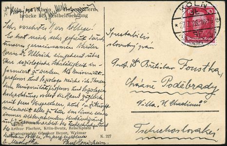 8938 | 35 € | 5000 KÖLN (Sonder- und Handwerbe-Stempel) : KÖLN/ FF/ *e/ FF/ 14.Deutsches Turnfest 1928 (27.7.) seltener SSt auf EF 10 Pf. Friedr.d.Große = Sondertarif CSR , Bedarfs-s/w.-Foto-Ak.: Hohenzollernbrücke in Festbeleuchtung in die C.S.R. (Bo.19 III = * e) | ![]() ![]() | |