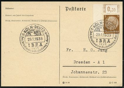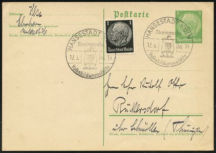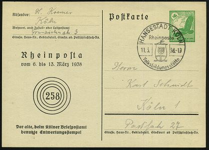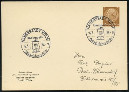 8941 | 15 € | 5000 KÖLN (Sonder- und Handwerbe-Stempel) : KÖLN HANSESTADT/ Rheinposta/ Volksbildungsstätte 1938 (6.3.) SSt (Hanse-Kogge mit Stadt-Wappen) auf PP 3 Pf. Hindenbg., braun: Walter Goecks.., klar gest. Inl.-Karte (Bo.38) | ![]() | |