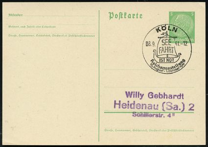 8945 | 18 € | 5000 KÖLN (Sonder- und Handwerbe-Stempel) : KÖLN/ SEE/ FAHRT/ IST NOT/ Reichsausstellung 1941 (8.9.) seltener SSt = Wikingerschiff , klar gest. Inl.-Karte (Bo.51) | ![]() | |