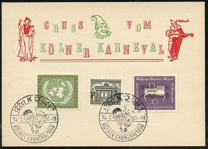 8952 | 18 € | 5000 KÖLN (Sonder- und Handwerbe-Stempel) : (22c) KÖLN 1/ KÖLNER KARNEVAL 1956 (12.2.) SSt = Köpfe von "Tünnes & Schäl" 2x klar rs. auf Color-Ausl.-Sonder-Kt.: GRUSS VOM KÖLNER KARNEVAL, = Michaelis unbekannt! (Bo.127) | ![]() | |
